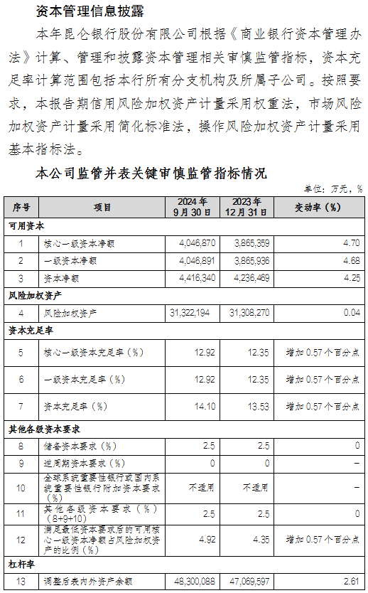 昆仑银行股份有限公司2024年3季度信息披露