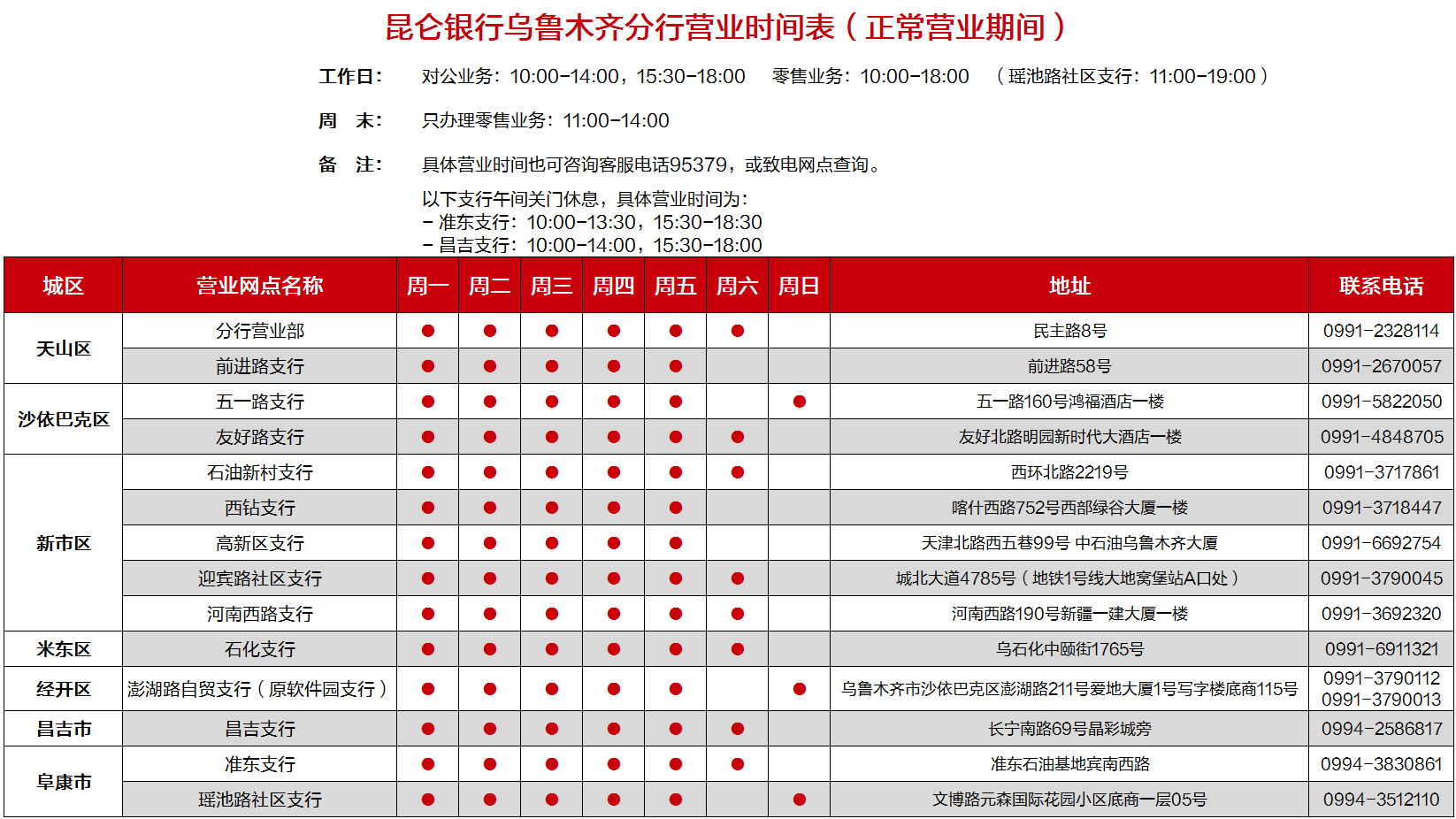 昆仑银行乌鲁木齐分行营业时间表