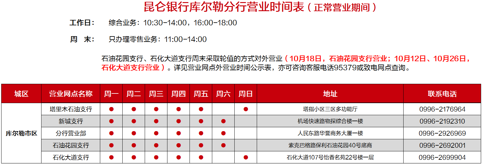 昆仑银行库尔勒分行营业时间表