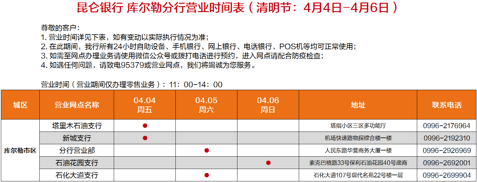 注:石油花园支行4月11日、4月25日,石化大道支行4月19日不对外营业