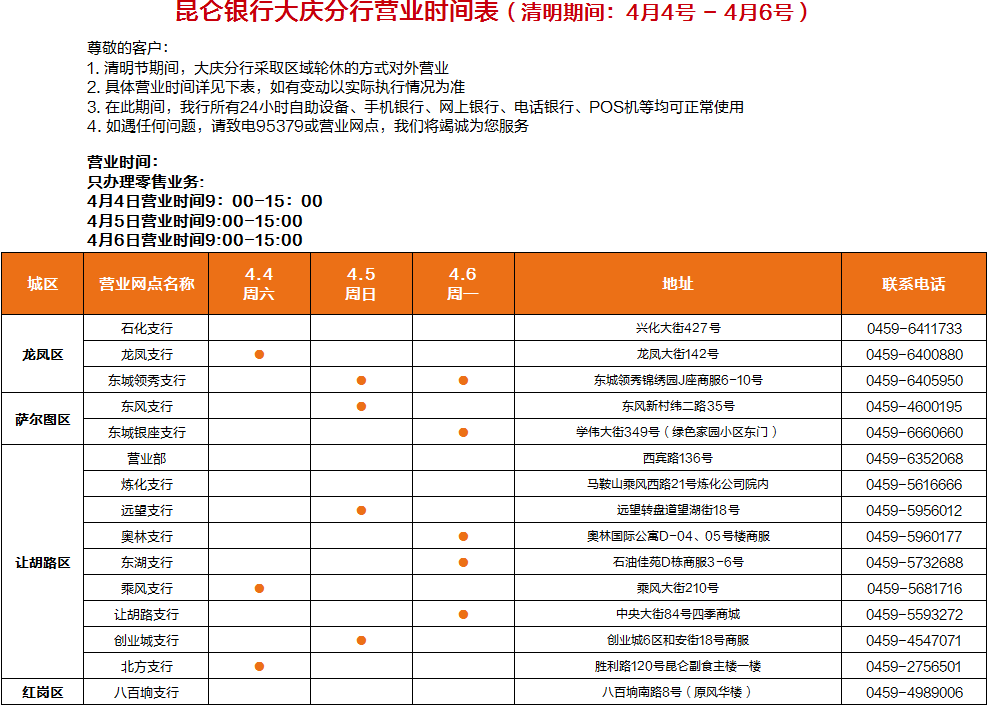 昆仑银行大庆分行营业时间表