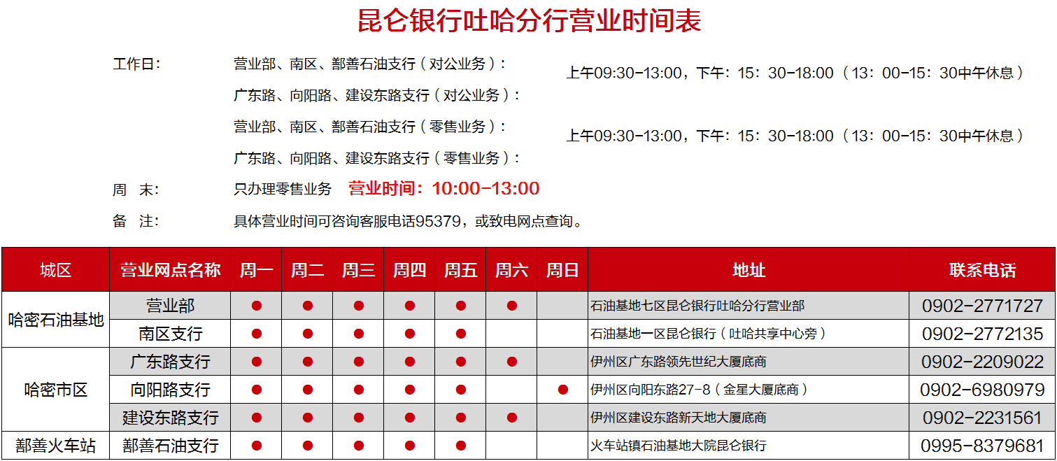 昆仑银行吐哈分行营业时间表